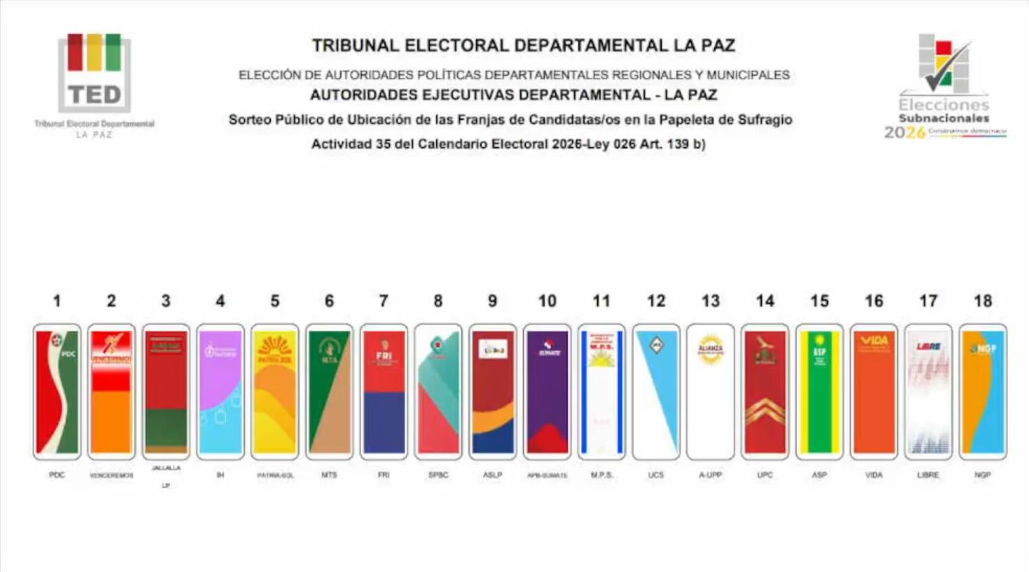 La Paz, 16 de ene 2026 (ATB Digital).- Se presenta el orden definitivo de los candidatos que aparecerán en la papeleta de sufragio para la Gobernación de la ciudad de La Paz, tras el sorteo realizado por el Tribunal Electoral Departamental.