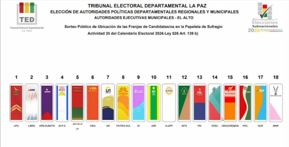 La Paz, 16 de ene 2026 (ATB Digital).- Se presenta el orden definitivo de los candidatos que figurarán en la papeleta de sufragio para las elecciones subnacionales de la Alcaldía de la ciudad de El Alto, de acuerdo con lo establecido por el sorteo del Tribunal Electoral Departamental.