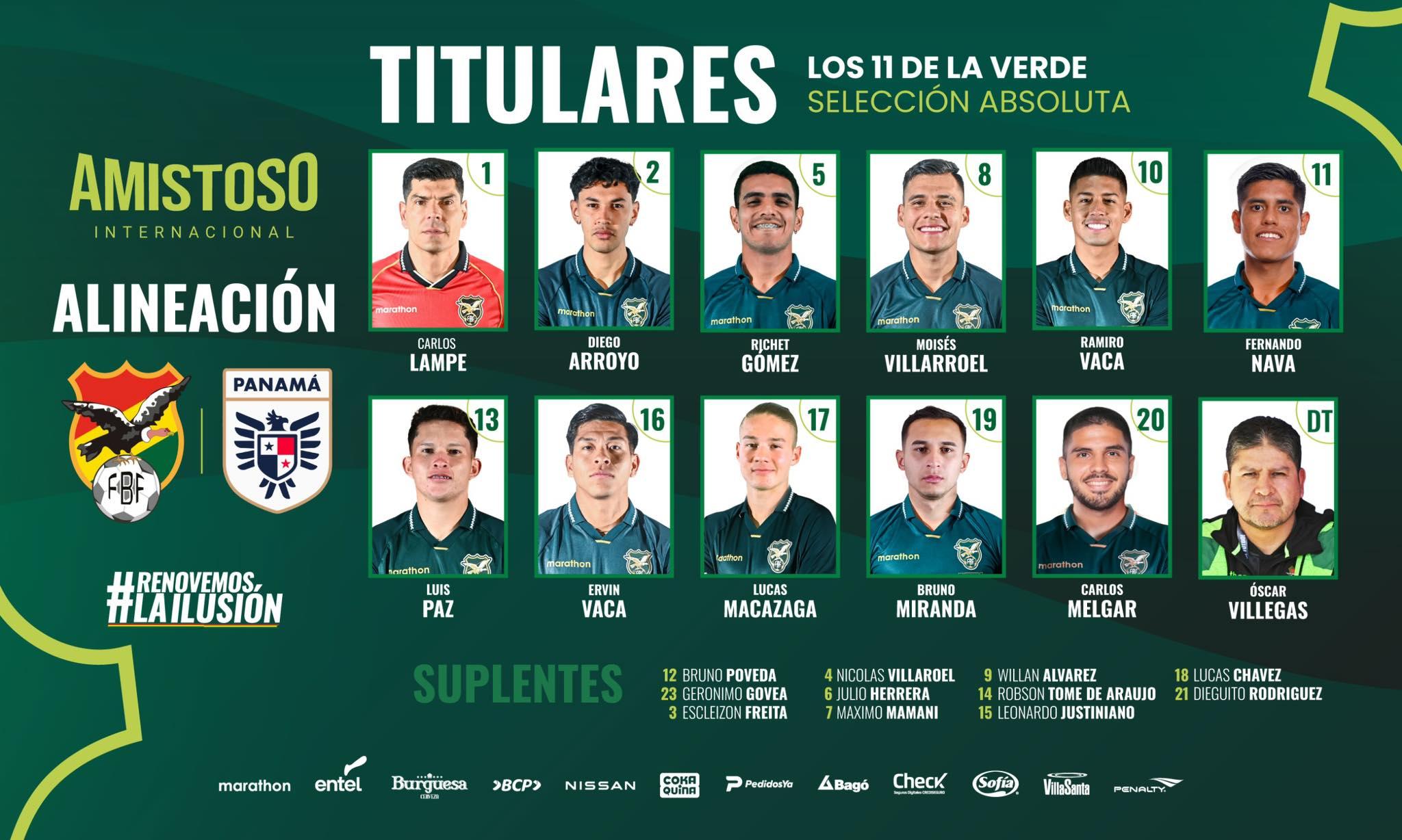 Tarija, 18 de ene 2026 (ATB Digital).- La selección boliviana presentó oficialmente su alineación titular para el partido amistoso internacional frente a Panamá, en el marco de su preparación y renovación del plantel absoluto. El encuentro forma parte del proceso de evaluación del cuerpo técnico con miras a futuras competencias oficiales. El mismo se dará en el estadio IV Centenario de Tarija a las 17:00.