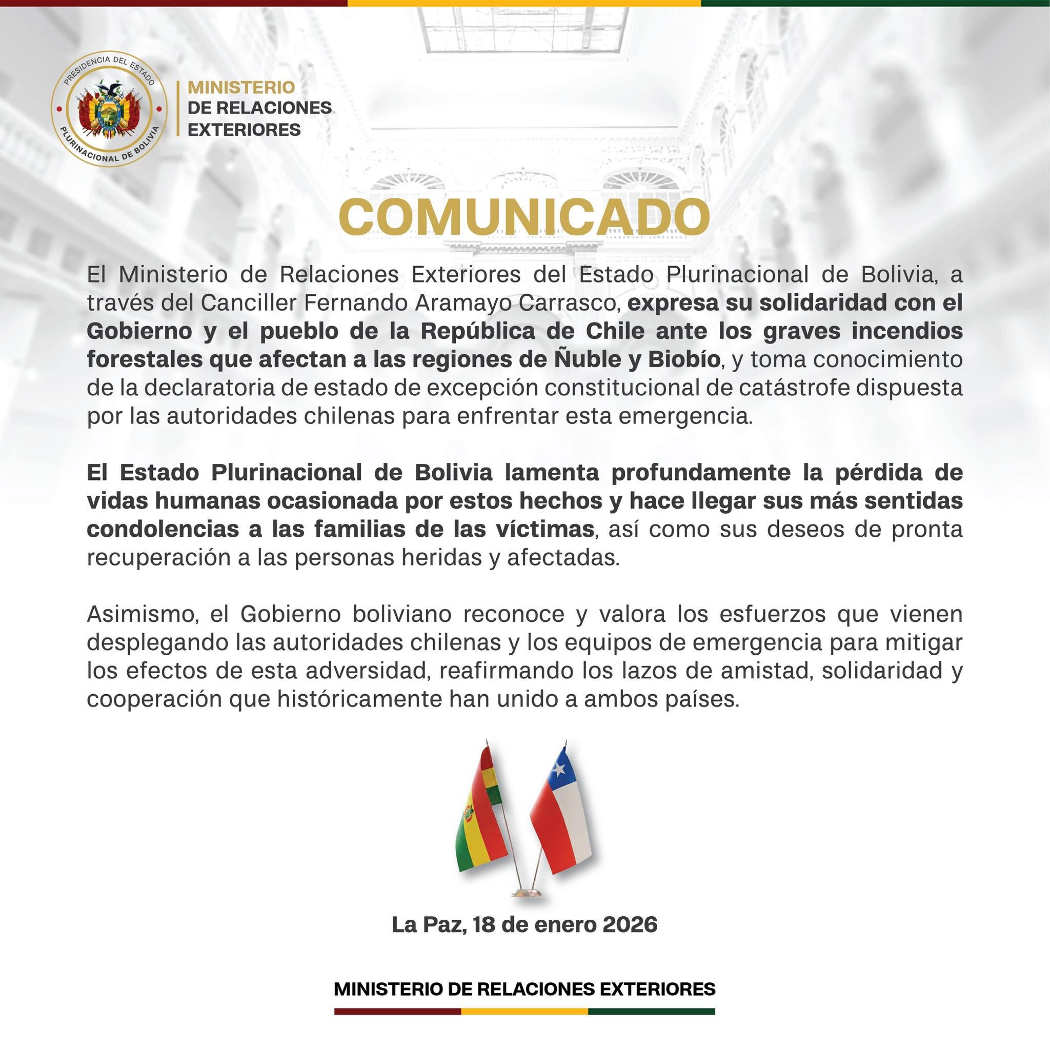 La Paz, 18 de ene 2026 (ATB Digital).- El Ministerio de Relaciones Exteriores del Estado Plurinacional de Bolivia expresó su solidaridad con el Gobierno y el pueblo de Chile ante los graves incendios forestales que afectan a las regiones de Ñuble y Biobío.