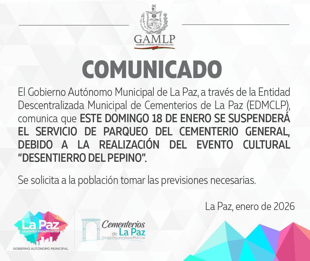 La Paz, 18 de ene 2026 (ATB Digital).- La Alcaldía de La Paz informó que este 18 de enero se suspenderá el servicio de parqueo del Cementerio General, debido a la realización del “desentierro del pepino”, una de las actividades más representativas del calendario carnavalero paceño. La comuna recomendó a la población tomar previsiones.
