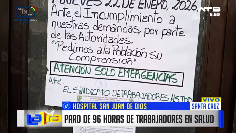 Santa Cruz, 19 de ene 2026 (ATB Digital).- Trabajadores de salud del Hospital San Juan de Dios iniciaron un paro de 96 horas ante el incumplimiento en el pago de salarios desde noviembre del año pasado.