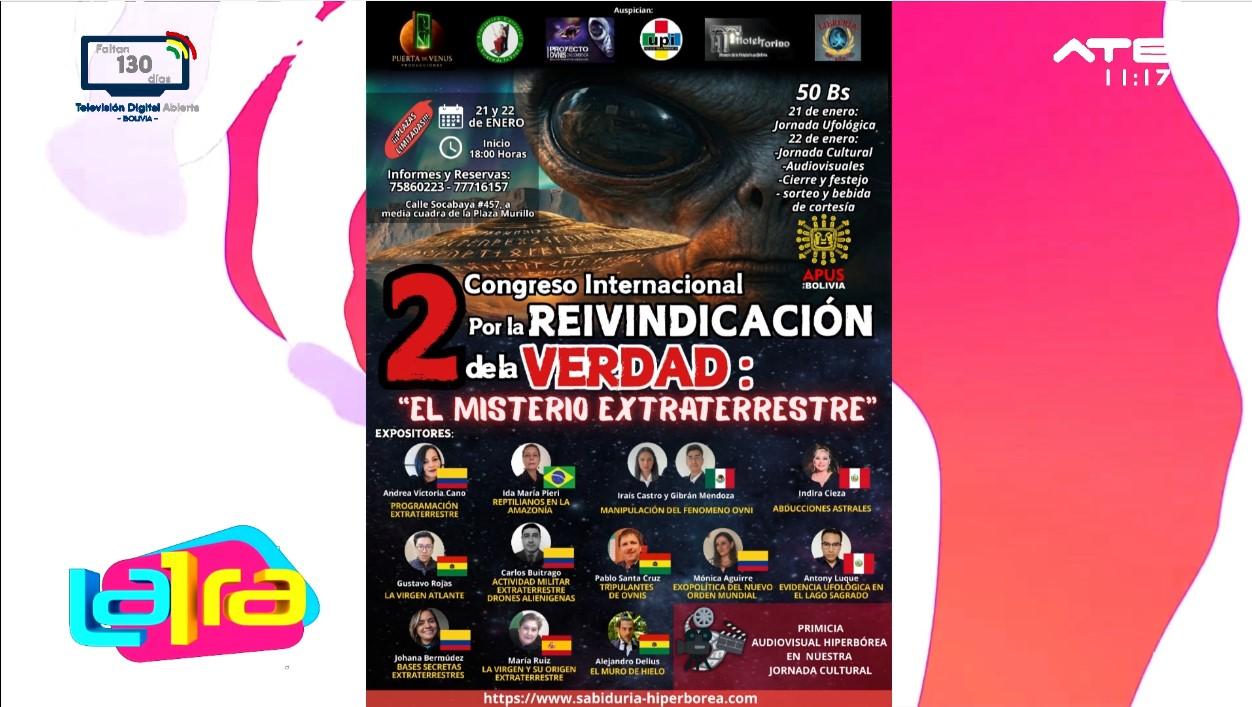 La Paz, 20 de ene 2026 (ATB Digital) .- El “2° Congreso internacional por la reivindicación de la verdad: ´El Misterio Extraterrestre´” congregará a expertos de Perú, España, Brasil, Bolivia, México y Colombia; tocarán temas que siempre han sido puestos en mesa de debate: ¿existen los duendes, hadas, extraterrestres?, ¿qué significan las experiencias paranormales?, ¿qué son los viajes astrales?, ¿qué se entiende por el nuevo orden mundial? El encuentro pretende disipar las dudas. ¡No faltes!