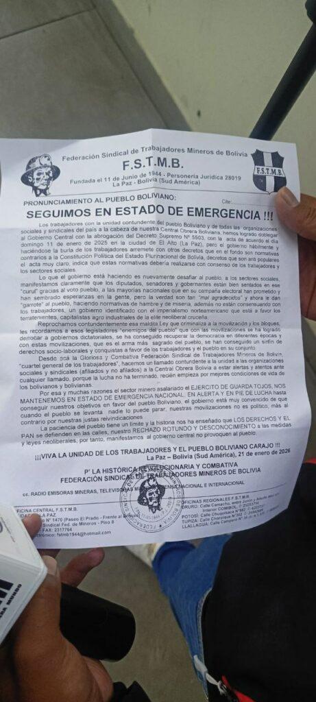 La Paz, 21 de ene 2026 (ATB Digital).- El secretario ejecutivo de la Federación Sindical de Trabajadores Mineros de Bolivia (FSTMB), Andrés Paye, manifestó su rechazo a la ley antibloqueos que se debate en la Asamblea Legislativa, argumentando que no se debe criminalizar la protesta social.