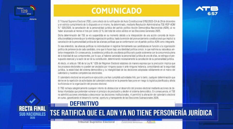 La Paz, 21 de ene 2026 (ATB Digital).- El Tribunal Supremo Electoral ratificó la cancelación definitiva de la personería jurídica del partido Acción Democrática Nacionalista (ADN), tras no alcanzar el 3 % de los votos en las elecciones generales de 2025. El TSE advierte que los amparos presentados por el partido afectan el normal desarrollo de las elecciones subnacionales y confirma que la medida incluye también a las alianzas políticas que contaban con ADN como integrante.