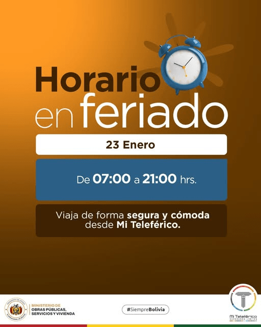 La Paz, 22 de ene 2026 (ATB Digital) .- La Empresa de Mi Teleférico dio a conocer los horarios de atención para el feriado del viernes 23 de enero. Sus operaciones iniciarán a partir de las 07:00 AM y concluirán a las 21:00 PM.