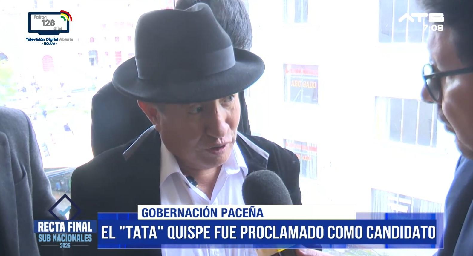 La Paz, 22 de ene 2026 (ATB Digital).- El dirigente “Tata” Quispe fue proclamado como candidato a la Gobernación de La Paz por Unidad Cívica Solidaridad, confirmando así su participación en las próximas elecciones subnacionales. La proclamación marca el inicio de su campaña oficial en el departamento, donde buscará consolidar su propuesta política y captar el apoyo de la ciudadanía paceña de cara a la contienda electoral.