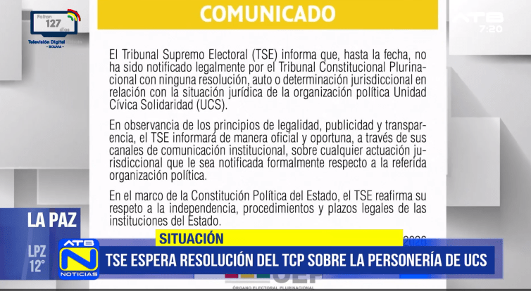 La Paz, 23 de ene 2026 (ATB Digital).- Durante la jornada de este jueves, el partido Unidad Cívica Solidaridad (UCS) presentó a su candidato “Tata” Quispe, pese a encontrarse en una etapa de análisis sobre su personería jurídica, debido a que no alcanzó el 3% mínimo en las pasadas elecciones nacionales; ante esta situación, el Tribunal Supremo Electoral (TSE) emitió la tarde de este viernes un comunicado en el que precisa que, hasta la fecha, no ha sido notificado legalmente por el Tribunal Constitucional con ninguna resolución, auto o determinación jurisdiccional sobre el caso.