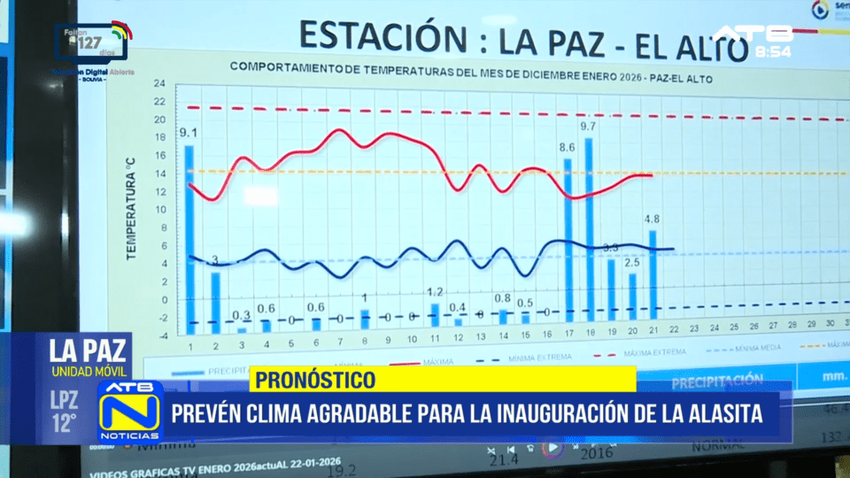 La Paz, 23 de ene 2026 (ATB Digital).- El Servicio Nacional de Meteorología e Hidrología (Senamhi) informó que durante el fin de semana se registrará cielo poco nuboso con lluvias dispersas en La Paz y El Alto. Para el lunes y martes se prevén lluvias con tormentas eléctricas en Oruro, Potosí, Pando, Beni y el norte paceño, además de precipitaciones en los valles.