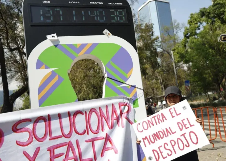 «El Mundial trae un sinnúmero de consecuencias que van desde la contaminación, el desplazamiento forzado de familias populares, comunidades y pueblos originarios, el despojo de bienes comunes como el agua o el aumento del costo del alquiler en un 155 %», denunció Diana, joven encargada de leer el manifiesto junto al reloj en el céntrico Bosque de Chapultepec y que marca la cuenta regresiva en la capital para que comience el torneo de fútbol.