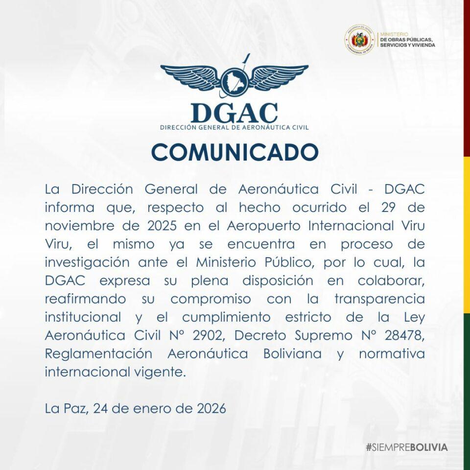La Paz, 24 de ene 2026 (ATB Digital).- La Dirección General de Aeronáutica Civil (DGAC) informó que el hecho ocurrido el 29 de noviembre de 2025 en el Aeropuerto Internacional Viru Viru se encuentra actualmente en proceso de investigación ante el Ministerio Público. Mediante un comunicado, la institución manifestó su plena disposición para colaborar con las autoridades competentes, ratificando su compromiso con la transparencia institucional. El pronunciamiento fue emitido este 24 de enero de 2026.