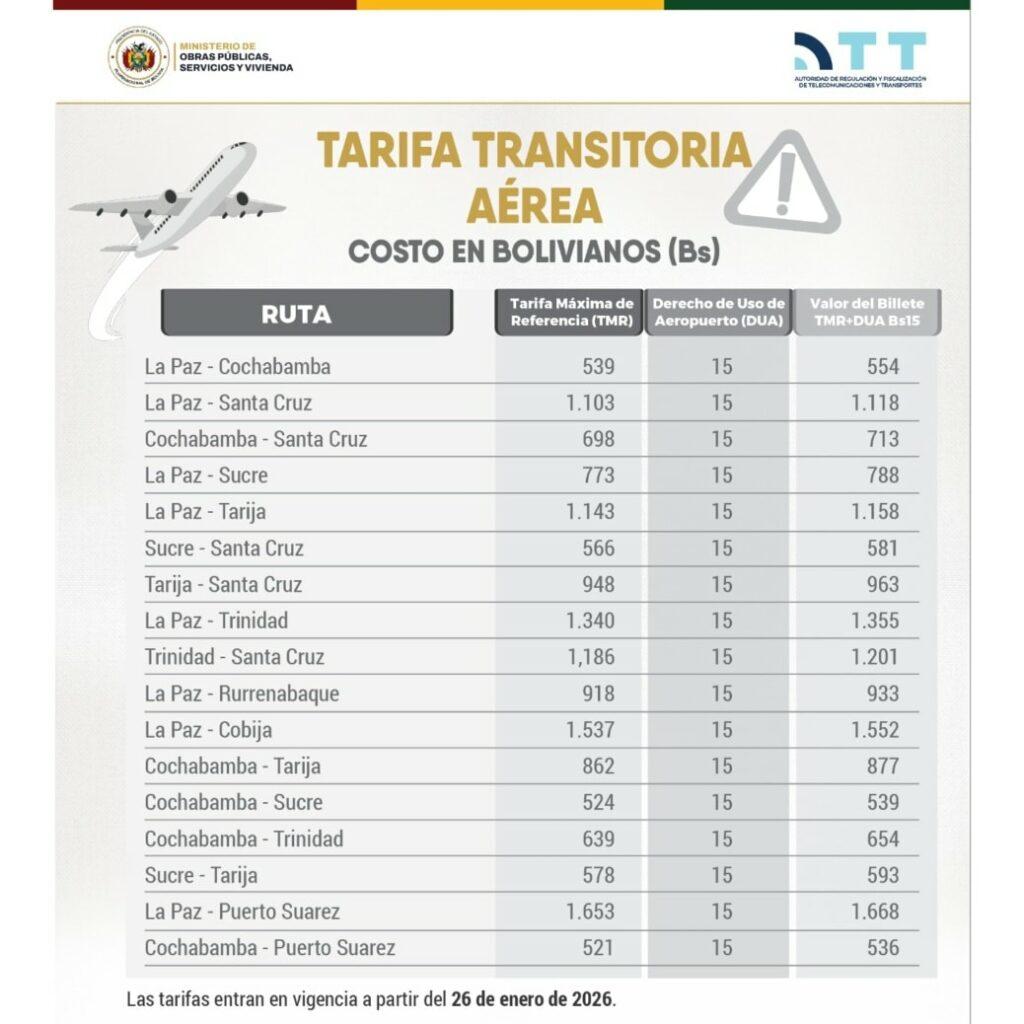 Las tarifas establecidas incluyen los valores de referencia por ruta, expresados en bolivianos, y contemplan el cobro adicional correspondiente al uso de aeropuerto. La información detallada se encuentra disponible en los anexos oficiales difundidos por la entidad reguladora.