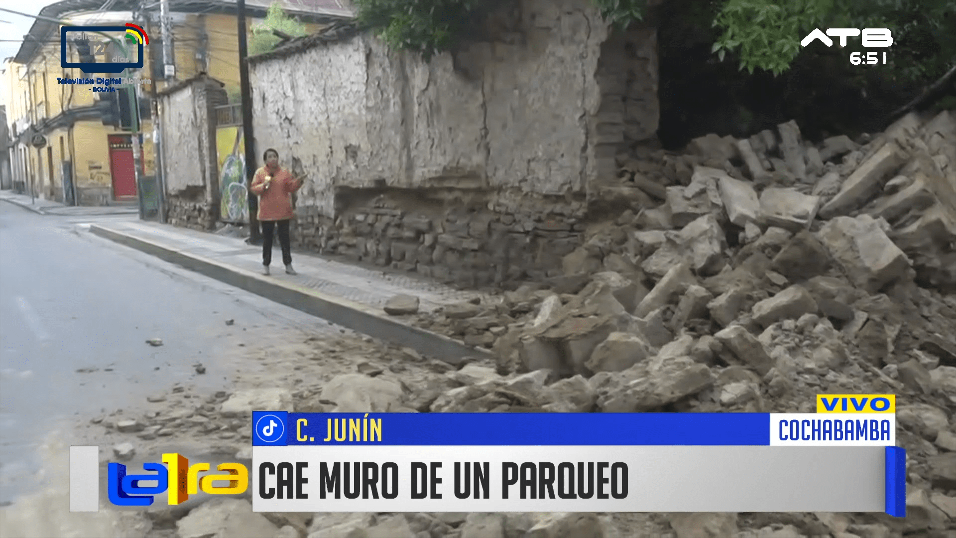 Cochabamba, 26 de ene 2026 (ATB Digital).- Las intensas lluvias registradas en Cochabamba provocaron el derrumbe de una pared de adobe en la calle Junín, correspondiente a un parqueo, sin que se reporten personas heridas.