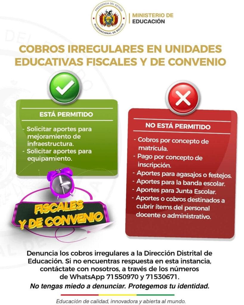La Paz, 26 de ene 2026 (ATB Digital).- El Ministerio de Educación recordó que están prohibidos los cobros irregulares en unidades educativas fiscales y de convenio, e instó a padres de familia y estudiantes a denunciar cualquier exigencia económica que no esté autorizada por la normativa vigente.