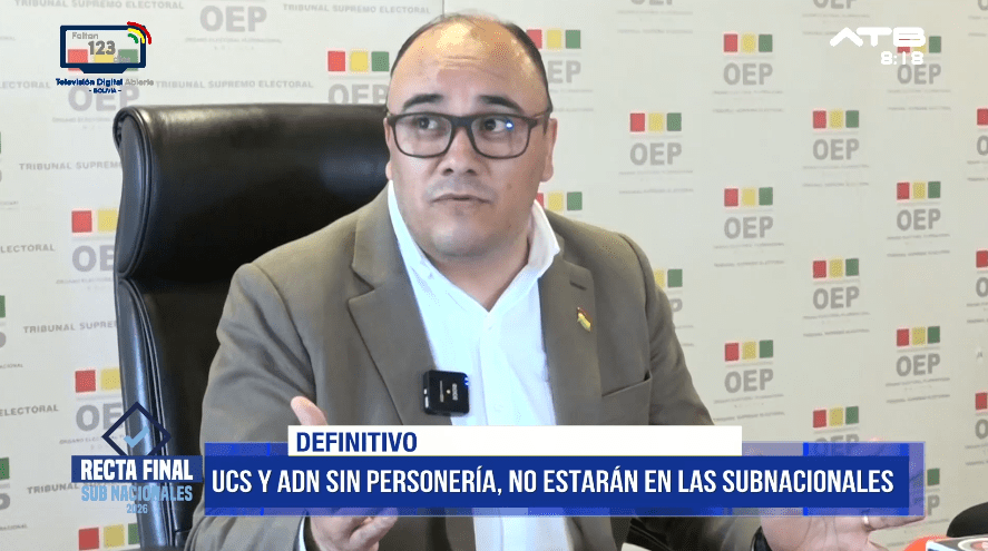 La Paz, 27 de ene 2026 (ATB Digital).- El presidente del TSE, Gustavo Ávila, informó que los partidos ADN y UCS perdieron su personería jurídica, por lo que no podrán participar en las elecciones subnacionales. La autoridad señaló que ambos frentes presentaron recursos ante el Tribunal Constitucional Plurinacional (TCP), instancia que ratificó la cancelación en el marco de la normativa vigente. Ávila aseguró que el órgano electoral hará cumplir la Constitución, pese a presuntas amenazas de algunos candidatos.
