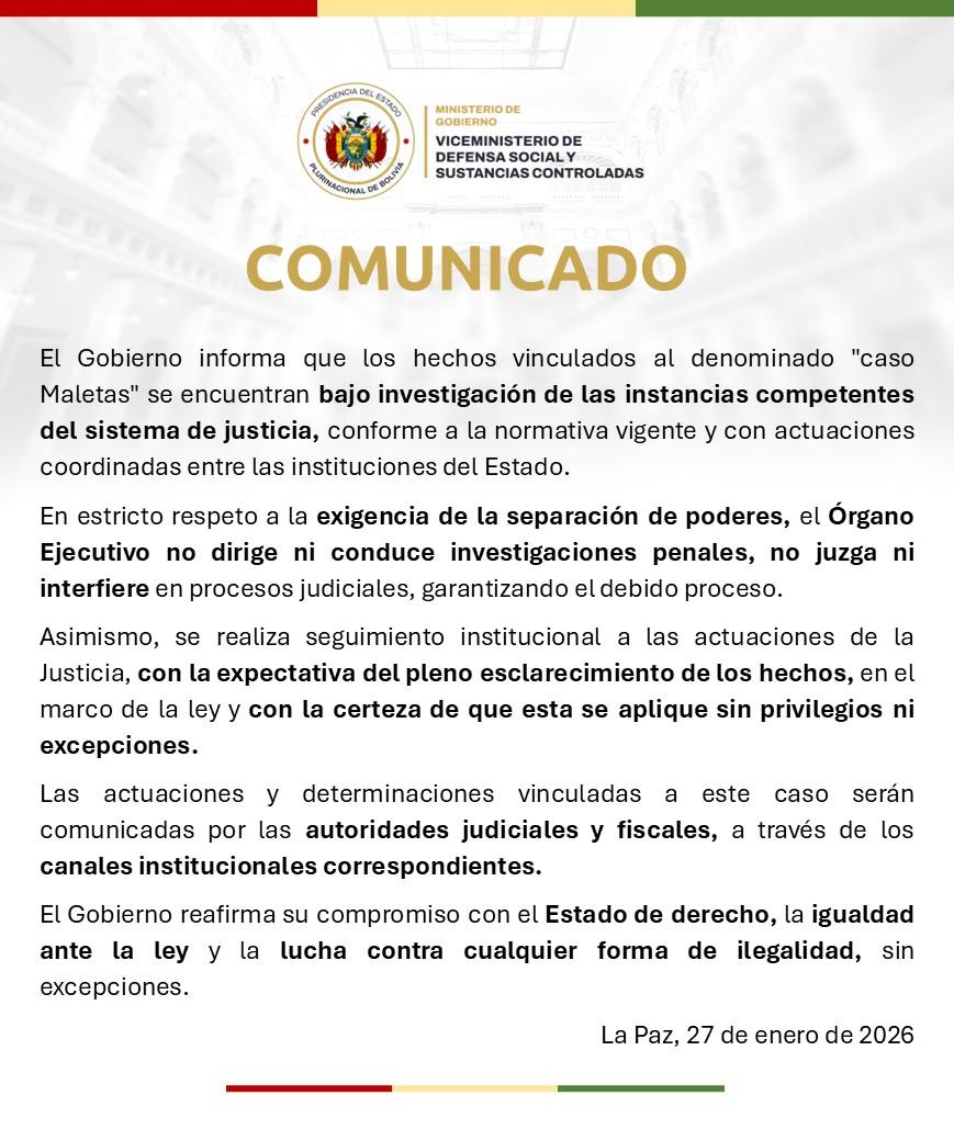 La Paz, 27 de ene 2026 (ATB Digital).- El Ejecutivo asegura que las investigaciones sobre el denominado “caso Maletas” están a cargo de las autoridades judiciales, garantizando la separación de poderes, el debido proceso y la aplicación de la ley sin privilegios.