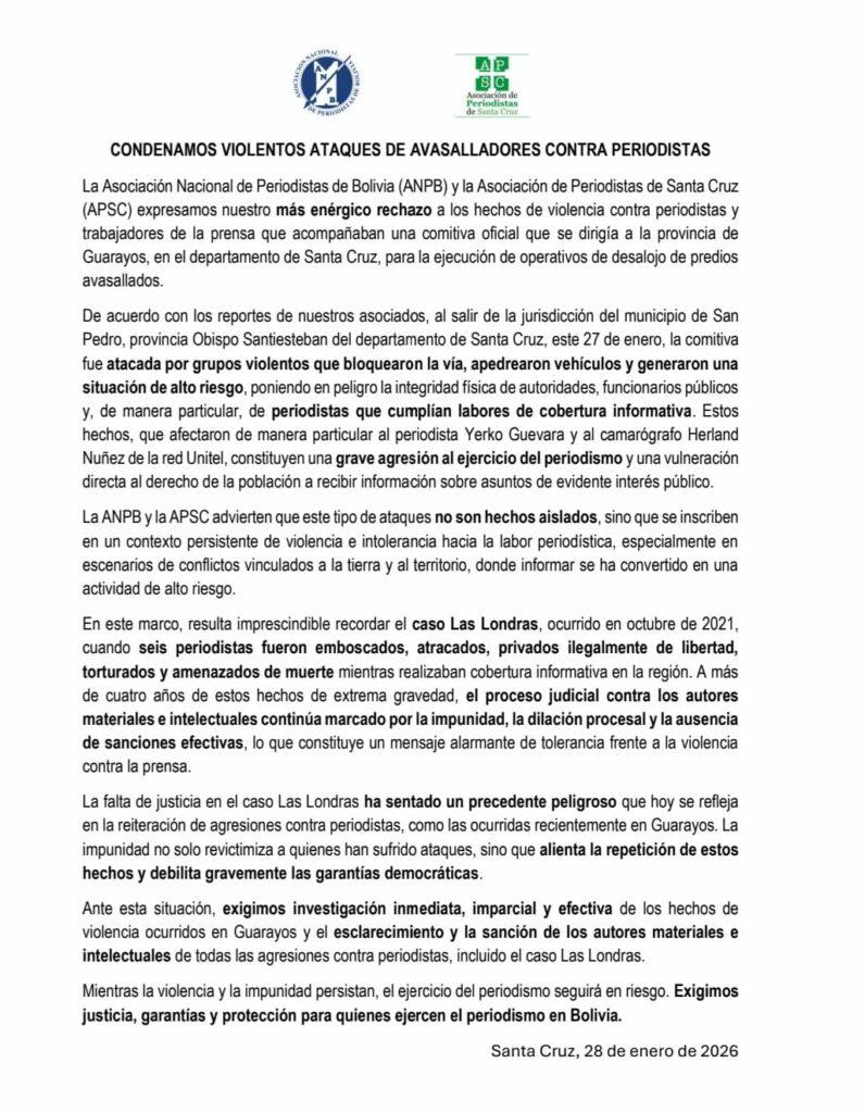 La Paz, 28 de ene 2026 (ATB Digital).- La Asociación Nacional de Periodistas de Bolivia (ANPB) y la Asociación de Periodistas de Santa Cruz (APSC) expresaron su más enérgico rechazo a los hechos de violencia contra periodistas y trabajadores de la prensa que acompañaban una comitiva oficial rumbo a la provincia de Guarayos, en el departamento de Santa Cruz, para la ejecución de operativos de desalojo de predios avasallados.