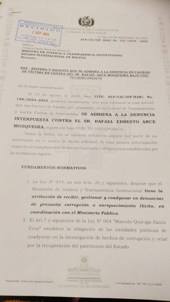 La Paz, 28 de ene 2026 (ATB Digital).- La Unidad de Transparencia y Lucha contra la Corrupción del Gobierno Central solicitó su adhesión al proceso judicial que se sigue contra Rafael Arce Mosqueira, reafirmando su compromiso en la investigación de actos irregulares.