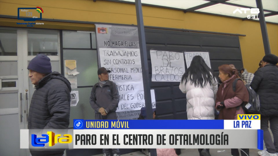 La Paz, 29 de ene 2026 (ATB Digital).- Un paro en el Centro de Oftalmología generó molestia en la población, ya que decenas de pacientes aguardaron desde tempranas horas de la madrugada, en algunos casos desde las 02:00, sin recibir información sobre la entrega de fichas ni el inicio de la atención. Los usuarios denuncian que no se avisó previamente sobre la medida de presión, cuyo presunto motivo sería la exigencia de contratos laborales.