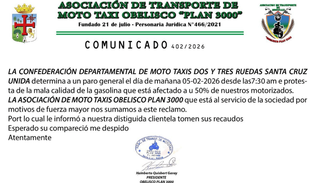 Santa Cruz, 5 de feb 2026 (ATB Digital) .- Este jueves 5 de febrero, mototaxistas instalaron bloqueos en la carretera que une a la capital cruceña con los municipios del Norte Integrado. Los manifestantes denuncian mala calidad de la gasolina, suministro distribuido por la estatal YPFB a las diferentes estaciones de servicio.