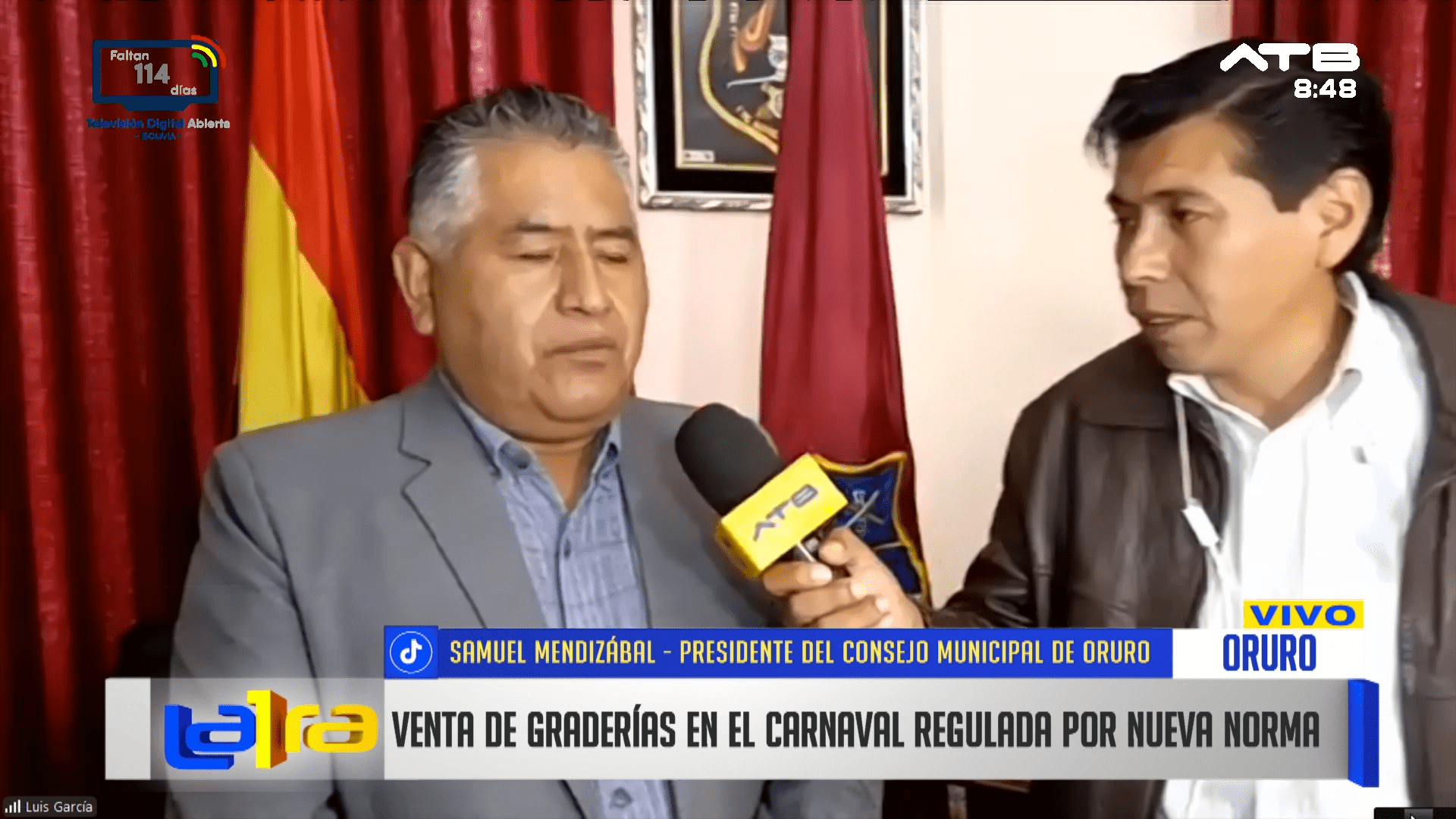 La Paz, 5 de feb 2026 (ATB Digital).- El presidente del Concejo Municipal de Oruro, Samuel Mendizábal, informó que se aprobó un proyecto de ley que regula la venta de graderías durante el Carnaval. La nueva norma busca ordenar y transparentar la comercialización de estos espacios para el público.