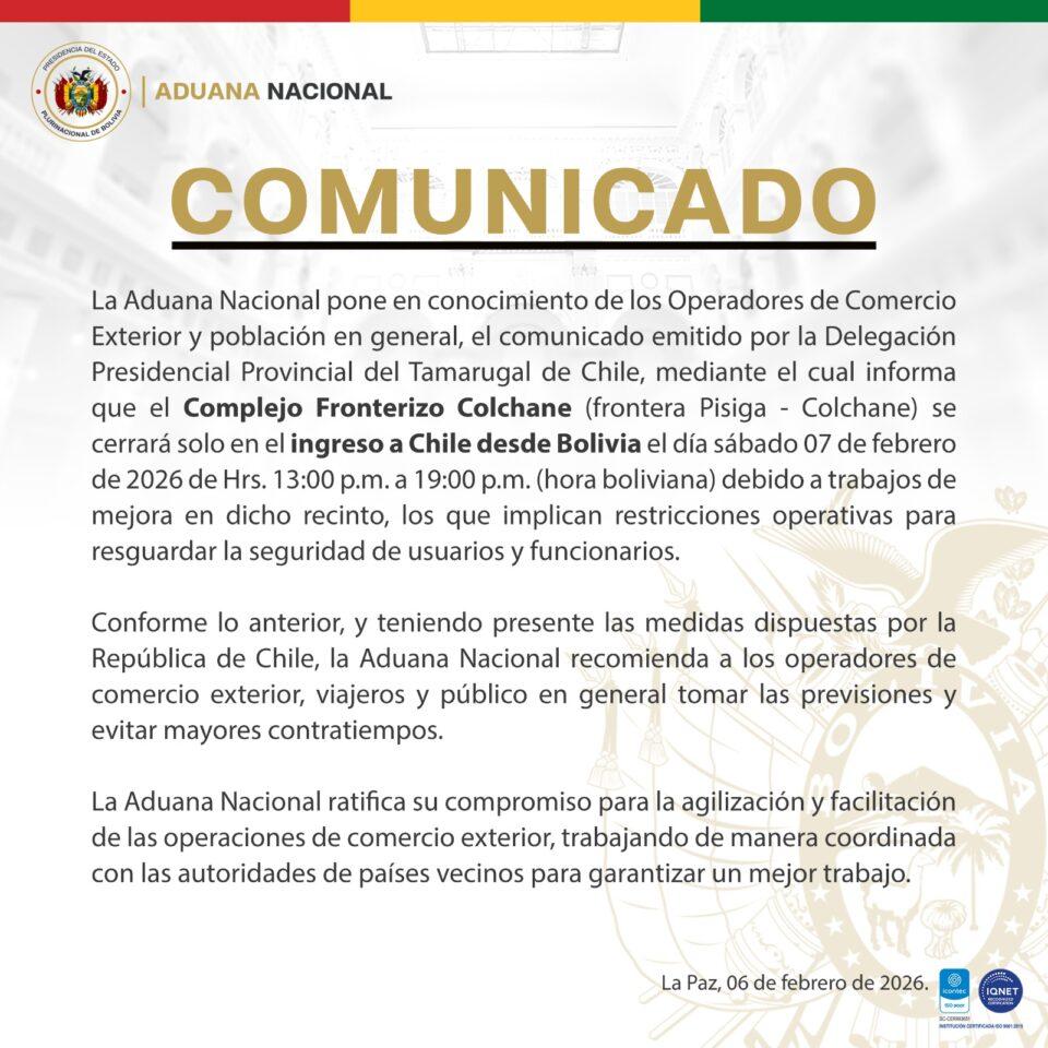 Oruro, 07 de feb 2026 (ATB Digital).- La Aduana Nacional informó que el Complejo Fronterizo Colchane (Pisiga–Colchane) cerrará el ingreso a Chile desde Bolivia este sábado 7 de febrero, entre las 13:00 y 19:00 (hora boliviana), debido a trabajos de mejora en el recinto fronterizo.
