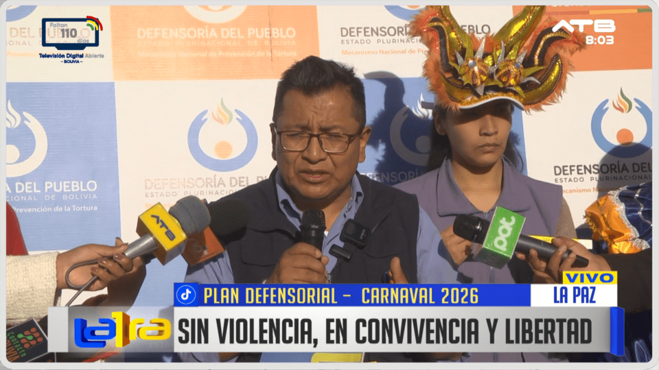 La Paz, 9 de feb 2026 (ATB Digital).- La Defensoría del Pueblo puso en marcha el Plan Defensorial Carnaval 2026, una estrategia orientada a promover unas fiestas sin violencia, en un ambiente de convivencia pacífica y libertad, con presencia institucional en puntos de alta concentración ciudadana.