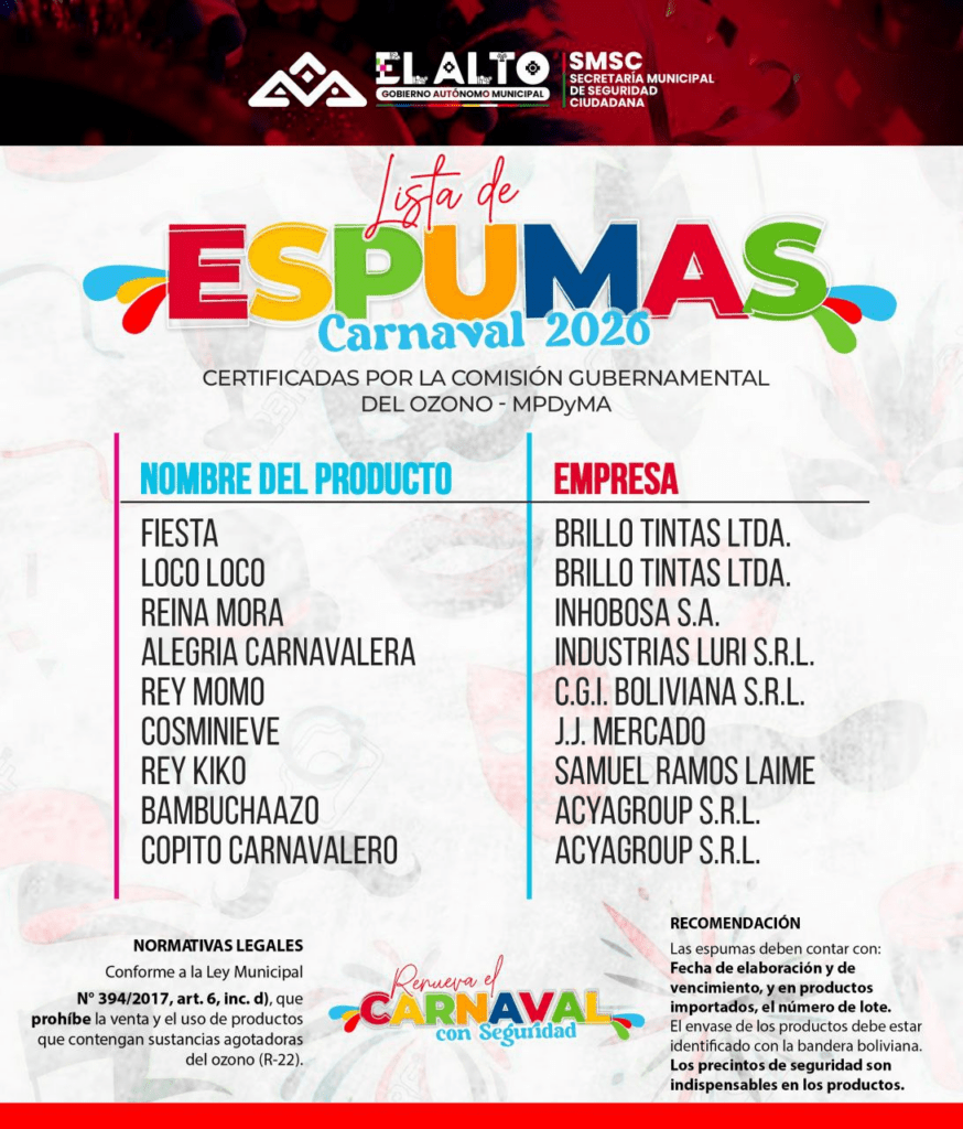 La Paz, 11 de feb 2026 (ATB Digital) .- Este miércoles 11 de febrero, la Alcaldía del municipio de El Alto dio a conocer la lista oficial de marcas autorizadas para la venta de espumas durante carnavales.