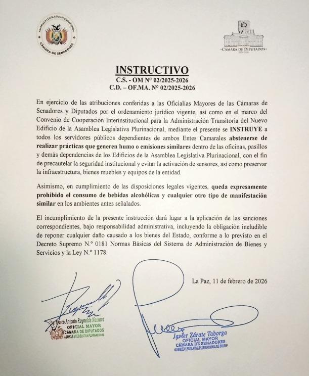 La Paz, 13 de feb 2026 (ATB Digital).- Un instructivo emitido por las Oficialías Mayores de las Cámaras de Senadores y Diputados instruye a los servidores públicos abstenerse de realizar prácticas que generen humo o emisiones dentro de oficinas, pasillos y dependencias de la Asamblea Legislativa Plurinacional. La disposición también prohíbe el consumo de bebidas alcohólicas y advierte sanciones administrativas ante incumplimientos, con el fin de resguardar la seguridad, la infraestructura y los bienes del Estado.