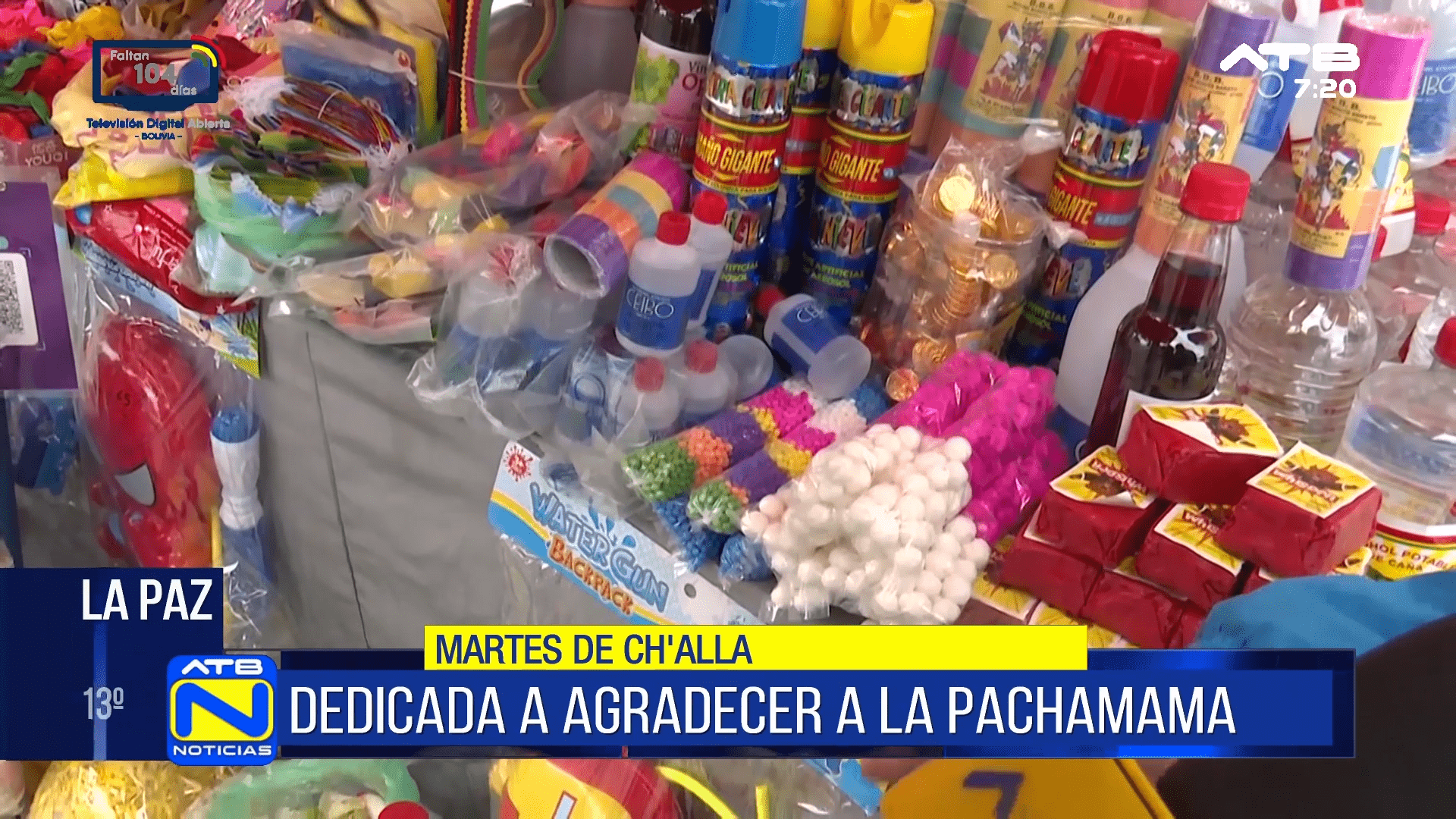 La Paz, 15 de feb 2026 (ATB Digital).- El martes de Ch’alla es una tradición propia del Carnaval, realizada como una forma de agradecimiento a la Pachamama. Entre los elementos tradicionales utilizados se encuentran serpentinas, confites, banderines, azúcar, flores y vino, además de otros productos que forman parte del ritual.