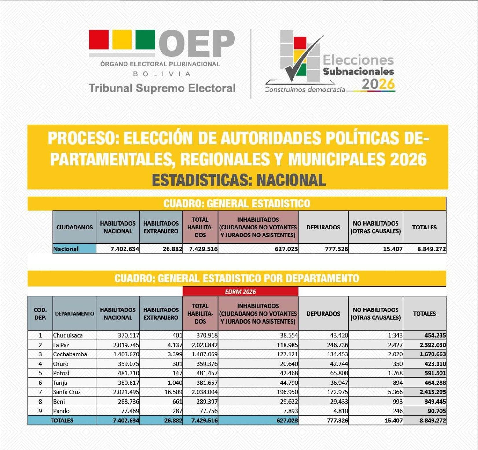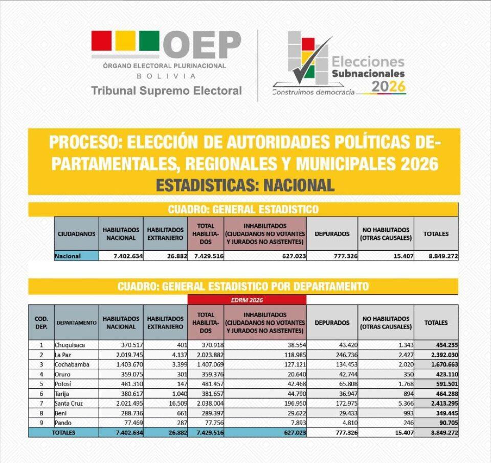 La Paz, 15 de feb 2026 (ATB Digital).- El Tribunal Supremo Electoral (TSE) informó este domingo 15 de febrero que 7.429.516 ciudadanos están habilitados para participar de las elecciones subnacionales que se desarrollarán en marzo. Del total de habilitados, 7.402.634 son ciudadanos nacionales y 26.882 son extranjeros.