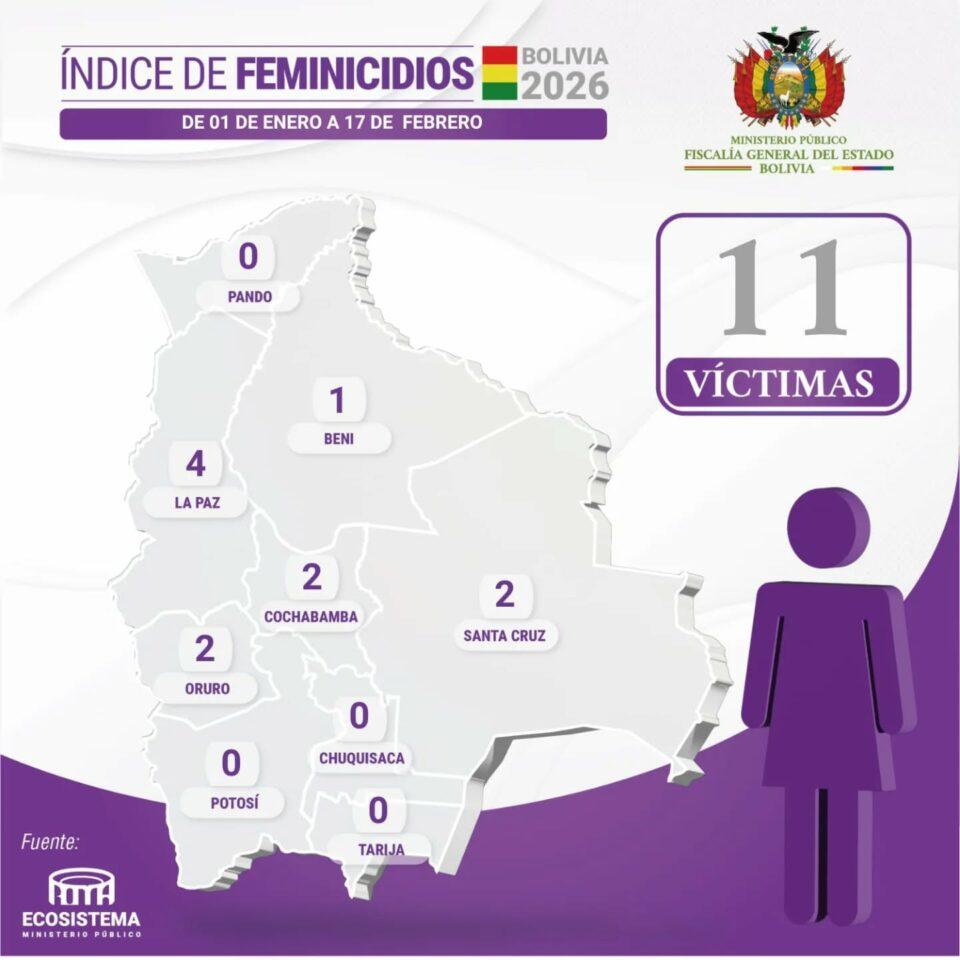 La Paz, 17 de feb 2026 (ATB Digital).- El Ministerio Público, a través de la Fiscalía General del Estado, reportó que del 1 de enero al 17 de febrero de 2026 se registraron 11 víctimas de feminicidio en el país.