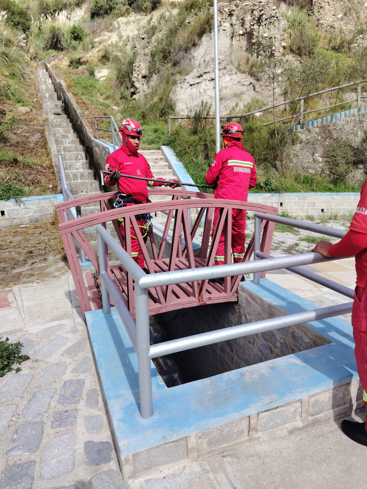 La Paz, 17 de feb 2026 (ATB Digital).- Efectivos de Bomberos La Paz “Antofagasta”, atendieron un llamado de emergencia para rescatar a un can que se encontraba atrapado en un desagüe de aproximadamente dos metros de profundidad.