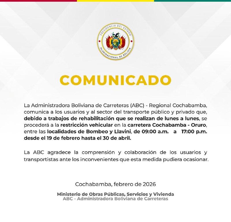 La Paz, 18 de feb 2026 (ATB Digital).- La Administradora Boliviana de Carreteras (ABC), en coordinación con el Ministerio de Obras Públicas, Servicios y Vivienda, informó sobre la restricción vehicular en la carretera Cochabamba – Oruro, específicamente entre las localidades de Bombeo y Llavini.