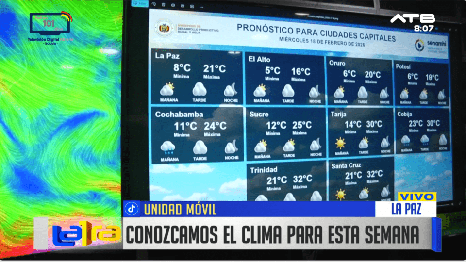 La Paz, 18 de feb 2026 (ATB Digital).- El Senamhi informó que en los próximos días se registrarán cielos nubosos y chubascos en la ciudad de La Paz, con probabilidad de lluvias persistentes. En otras regiones del país también se prevén chubascos aislados y tormentas eléctricas, manteniéndose condiciones de inestabilidad climática.