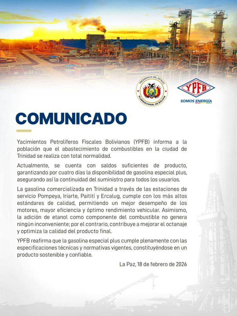 La Paz, 18 de feb 2026 (ATB Digital).- Yacimientos Petrolíferos Fiscales Bolivianos (YPFB) informó mediante un comunicado que el abastecimiento de combustibles en la ciudad de Trinidad, en el departamento del Beni, se desarrolla con total normalidad.