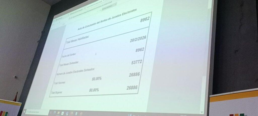 Santa Cruz, 20 de feb 2026 (ATB Digital).- De acuerdo al calendario electoral, este viernes se realizó el sorteo de 53.772 jurados electorales que estarán a cargo de 8.962 mesas de sufragio en las elecciones subnacionales previstas para el 22 de marzo. El proceso se desarrolló bajo supervisión de autoridades electorales, en cumplimiento de las actividades programadas.
