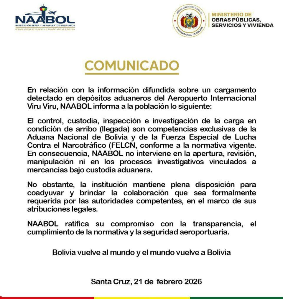 Santa Cruz, 21 de feb 2026 (ATB Digital).- La empresa estatal NAABOL emitió un comunicado en relación con la información difundida sobre un cargamento detectado en depósitos aduaneros del Aeropuerto Internacional Aeropuerto Internacional Viru Viru, en el que precisa el alcance de sus competencias.