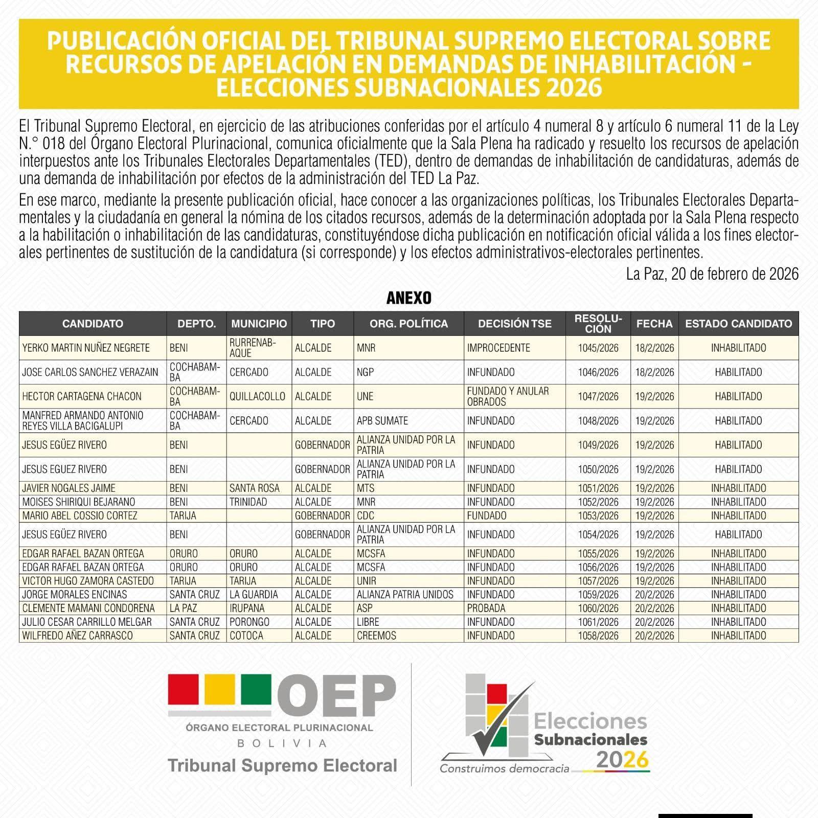 La Paz, 21 de feb 2026 (ATB Digital).- El Tribunal Supremo Electoral informó, mediante publicación oficial, que la Sala Plena radicó y resolvió los recursos de apelación interpuestos ante los Tribunales Electorales Departamentales dentro de demandas de inhabilitación de candidaturas, en el marco de las Elecciones Subnacionales 2026. La determinación incluye además una demanda vinculada a la administración del TED La Paz.