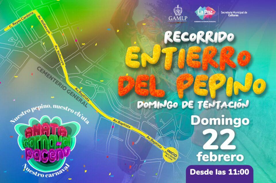 La Paz, 22 de feb 2026 (ATB Digital).- El Gobierno Autónomo Municipal de La Paz, a través de su Secretaría Municipal de Culturas, presentó el recorrido oficial del tradicional Entierro del Pepino, actividad que se realizará el domingo 22 de febrero desde las 11:00.