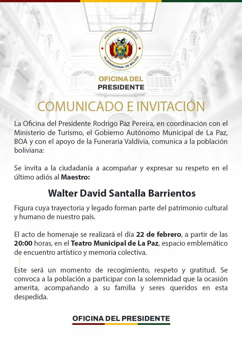 La Paz, 22 de feb 2026 (ATB Digital).- La Oficina del Presidente informó, mediante un comunicado oficial, la realización de un acto de homenaje póstumo en honor al maestro Walter David Santalla Barrientos, figura emblemática del arte y el humor nacional.