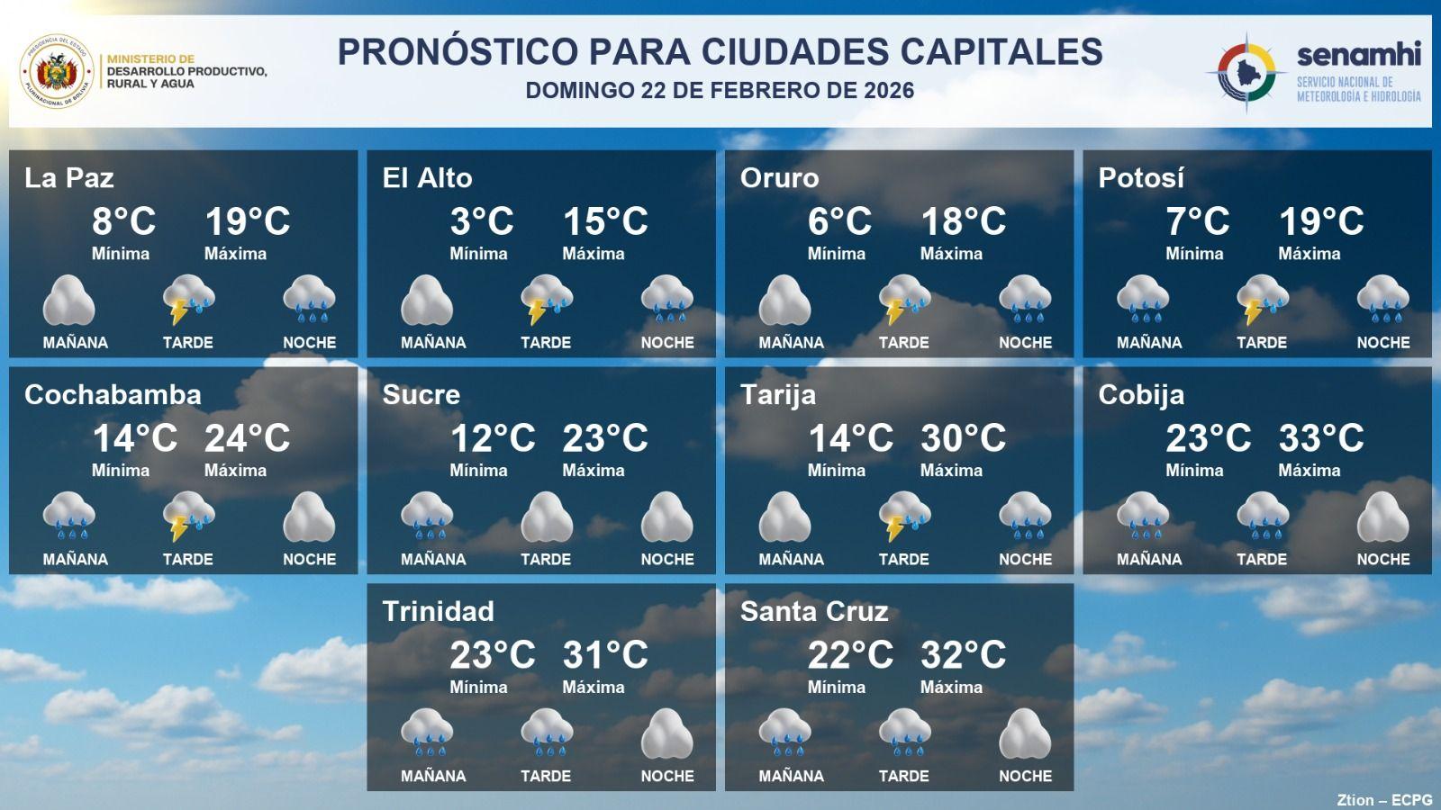 La Paz, 22 de feb 2026 (ATB Digital).- El Servicio Nacional de Meteorología e Hidrología (Senamhi), dependiente del Ministerio de Desarrollo Productivo, Rural y Agua, difundió el pronóstico del tiempo para las ciudades capitales correspondiente al domingo 22 de febrero.