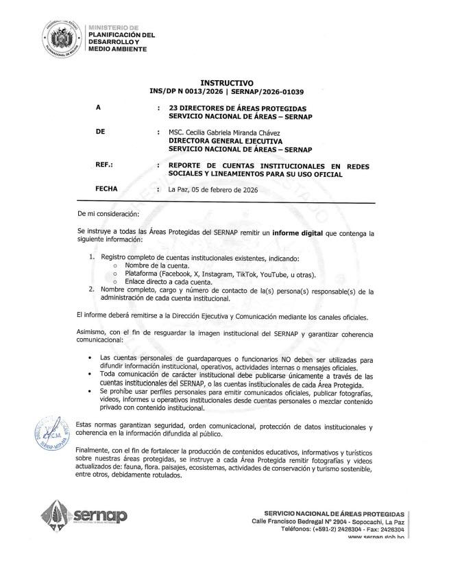 La Paz, 24 de feb 2026 (ATB Digital).- El Servicio Nacional de Áreas Protegidas (SERNAP), dependiente del Ministerio de Planificación del Desarrollo y Medio Ambiente, emitió el instructivo INS/DP N° 0013/2026 con lineamientos dirigidos a las 23 áreas protegidas del país para el reporte de cuentas institucionales en redes sociales y el uso oficial de plataformas digitales.