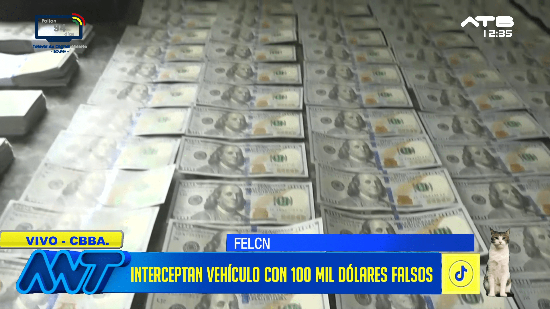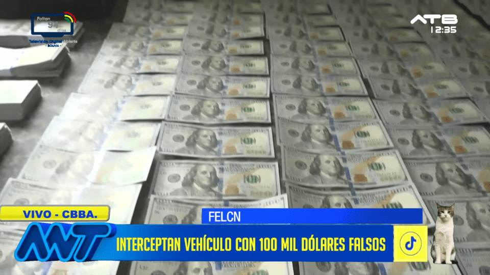 Cochabamba, 25 de feb 2026 (ATB Digital).- Efectivos de la FELCN en controles realizados en la Avenida Chapare, en Sacaba, interceptaron un vehículo en cuyo interior se encontraba una mujer de nacionalidad peruana en posesión de 100 mil dólares americanos falsos. Las autoridades iniciaron las investigaciones para determinar el origen del dinero y las posibles conexiones con actividades ilícitas.