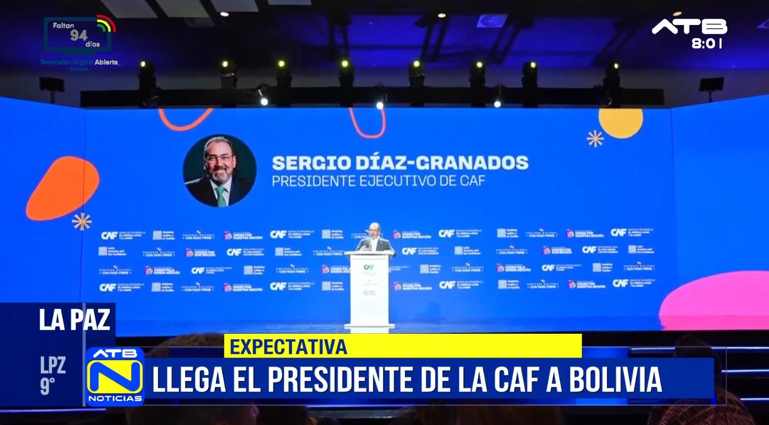 La Paz, 25 de feb 2026 (ATB Digital) .- El presidente de la CAF – Banco de Desarrollo de América Latina y el Caribe, Sergio Díaz-Granados, arribará la noche de este miércoles a Bolivia, donde sostendrá reuniones con el presidente del Estado, Rodrigo Paz, y con el sector empresarial de Santa Cruz. La visita busca consolidar una línea de financiamiento para los próximos cinco años, enfocada en infraestructura productiva, educación, salud y turismo, mientras legisladores analizan proyecciones y plantean las principales necesidades del país.