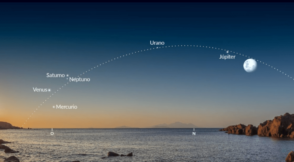 En segundo lugar, cuatro de ellos —Venus, Júpiter, Saturno y Mercurio— presentarán un brillo suficiente para ser detectados sin ayuda óptica, algo poco habitual en una sola noche. Por último, la visibilidad al anochecer ofrecerá una ventaja clara frente a otros eventos similares que requieren observaciones en horas de la madrugada.