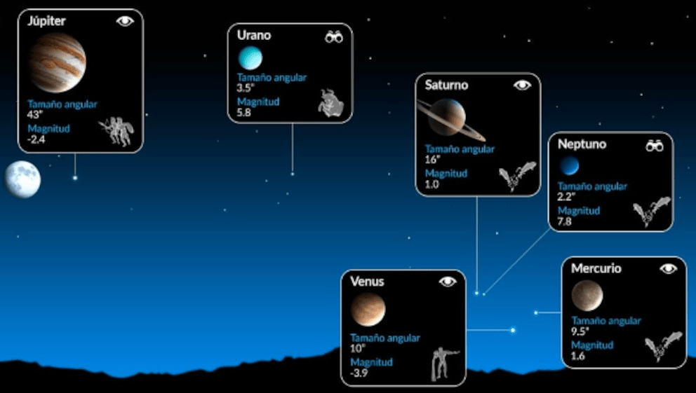 La planificación resultará fundamental. Comenzar la observación apenas el cielo oscurezca, contar con binoculares o un telescopio para los planetas más tenues y evitar obstáculos en el horizonte marcarán la diferencia. También será importante recordar que los planetas brillan de forma constante, a diferencia de las estrellas, un detalle útil para identificarlos con rapidez.