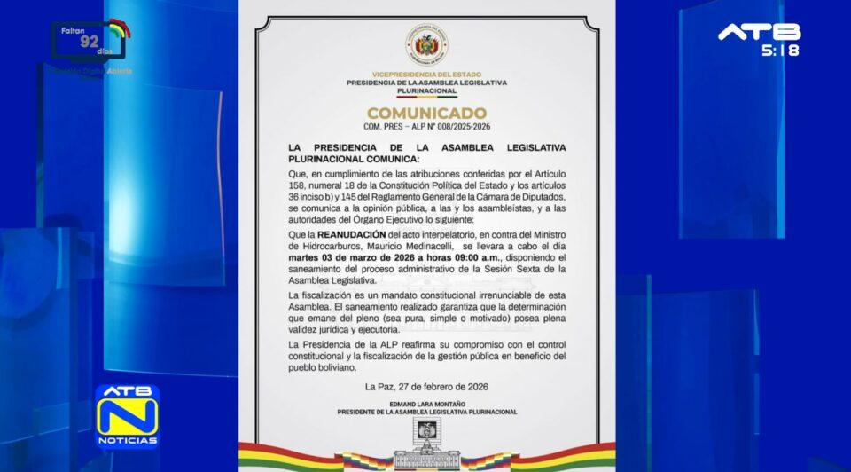 La Paz, 26 de feb 2026 (ATB Digital) .- La Presidencia de la Asamblea Legislativa Plurinacional, a cargo del vicepresidente Edmand Lara, informó que la interpelación al ministro de Hidrocarburos, Mauricio Medinacelli, será retomada el próximo 3 de marzo de 2026.
