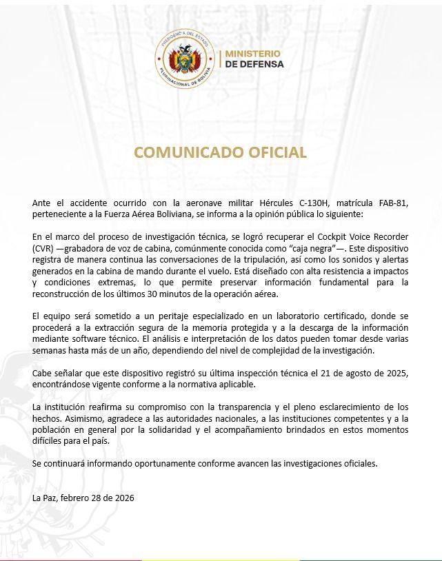 La Paz, 28 de feb 2026 (ATB Digital).- El Ministerio de Defensa de Bolivia informó sobre el hallazgo de la “caja negra” o la grabadora de voz de cabina del avión accidentado en la ciudad de El Alto.