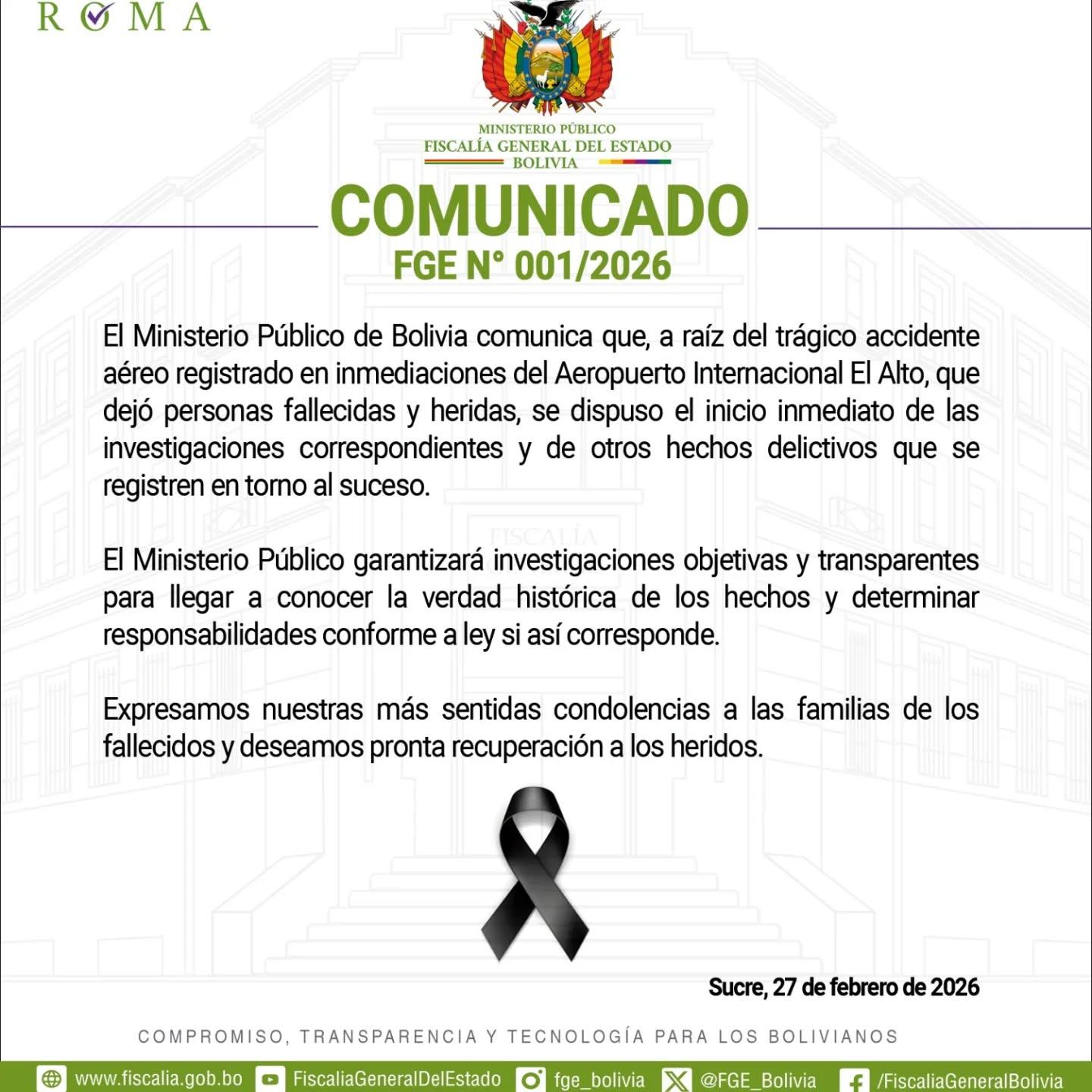 La Paz, 28 de feb 2026 (ATB Digital).- El Ministerio Público anunció el inicio inmediato de investigaciones tras el trágico accidente aéreo registrado en inmediaciones del Aeropuerto Internacional El Alto, hecho que dejó personas fallecidas y heridas.